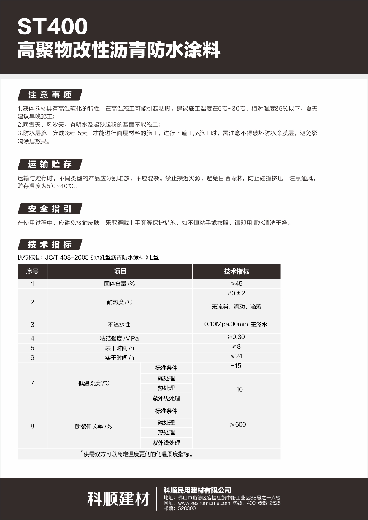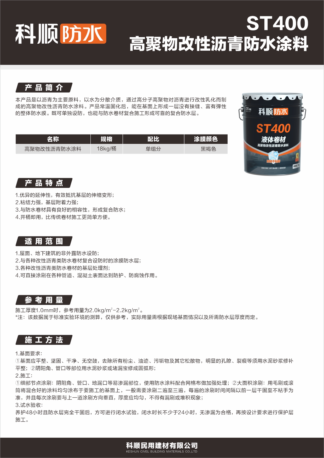 本产品是以沥青为主要原料,以水为分散介质,通过高分子高聚物对沥青进行改性乳化而制成的高聚物改性沥青防水涂料。产品常温固化后,能在基面上形成一层没有接缝、富有弹性的整体防水膜。既可单独设防,也能与防水卷材复合施工形成可靠的复合防水层。
