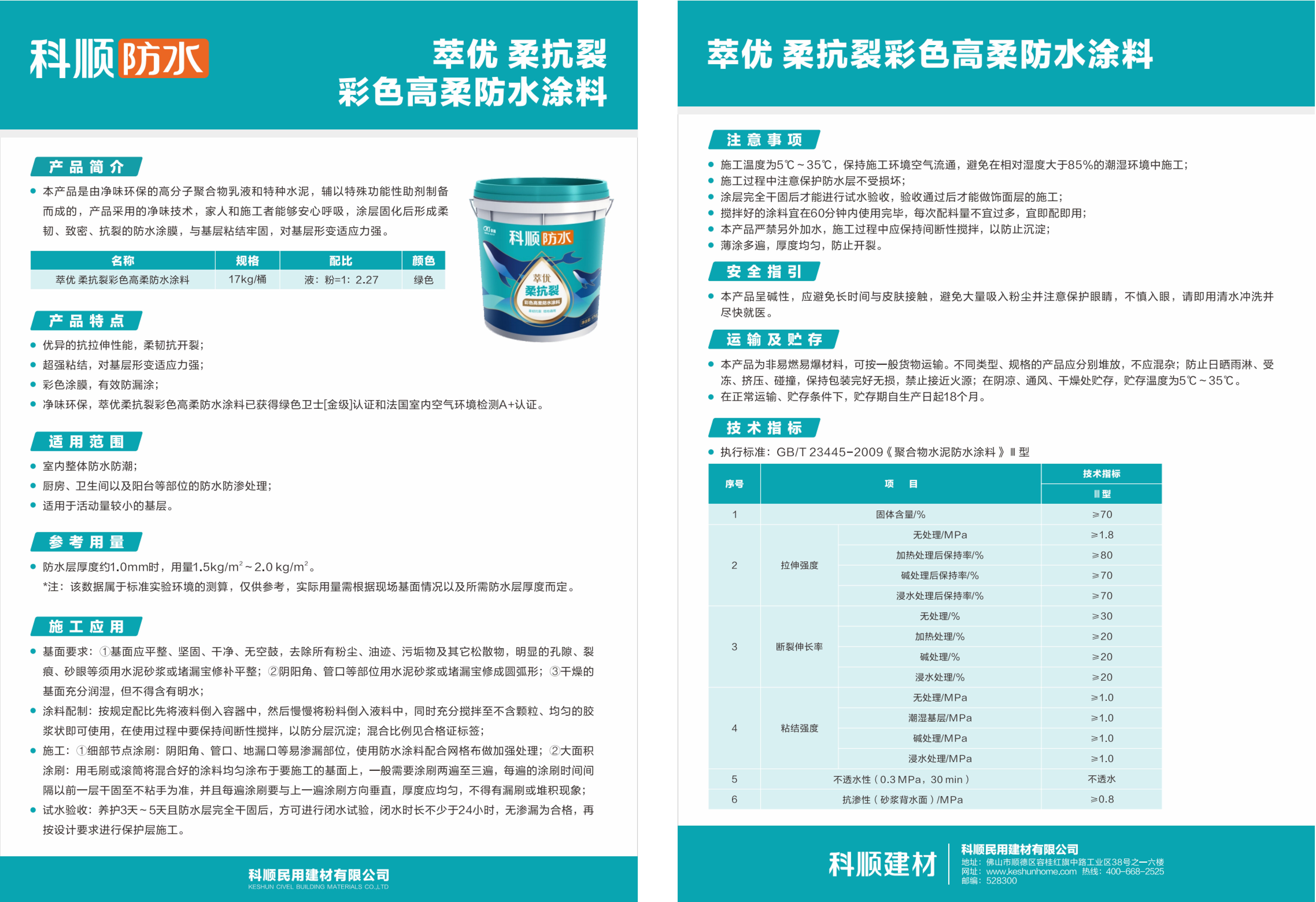 本产品是由净味环保的高分子聚合物乳液和特种水泥,辅以特殊功能性助剂制备而成的,产品采用的净味技术,家人和施工者能够安心呼吸,涂层固化后形成柔韧、致密、抗裂的防水涂膜,与基层粘结牢固,对基层形变适应力强。